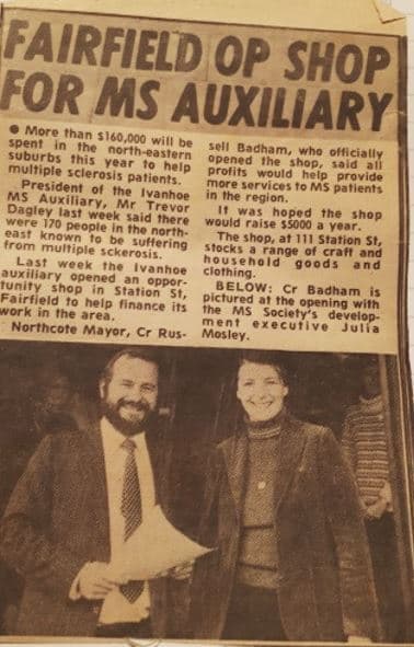 Pictured below: Then Northcote Mayor, Cr Russell Badham opens the MS Community Shop in Fairfield with Julia Mosley in the 1970s.